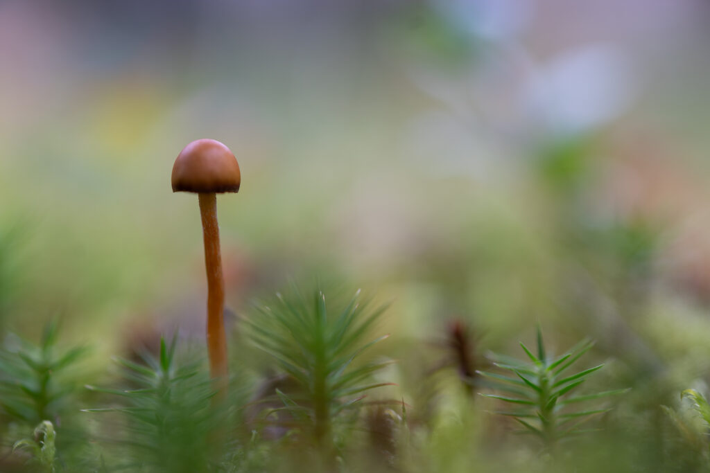 över mossan och trots sin litenhet så verkar den hög och reslig när jag kommer riktigt nära bland marktäckarna .